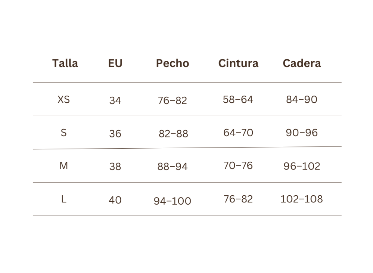 La modelo lleva una talla S y sus medidas son: altura: 1,73 m, pecho: 86 cm, cintura: 65 cm, cadera: 95 cm